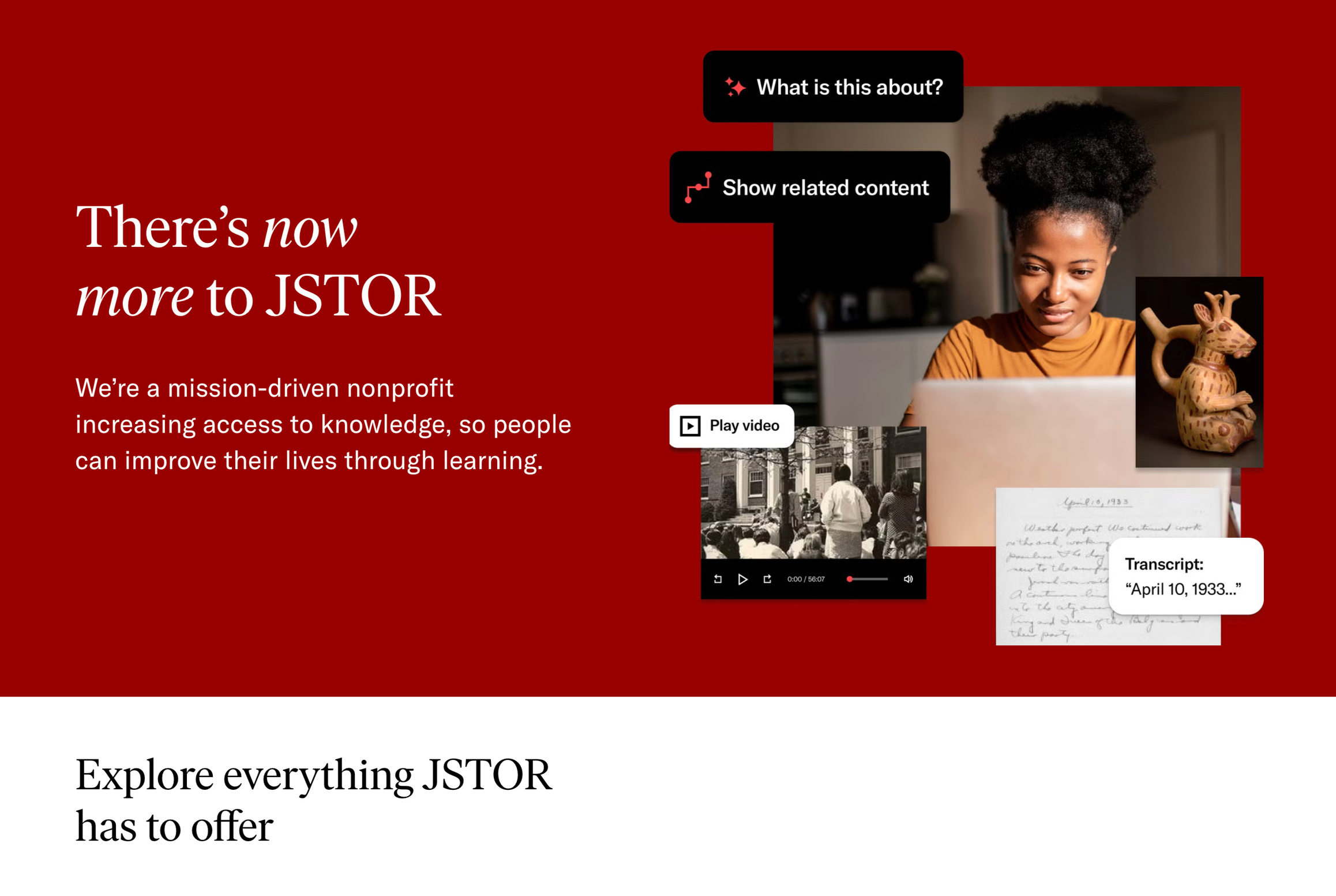 The humanities, arts, and social sciences disciplines are deeply human explorations that no machine can match. With it we develop critical thinking, creative innovation, cultural understanding, and civic engagement. That’s why ITHAKA—JSTOR’s parent brand—launched a new platform for these materials to be discoverable now, and in the future.